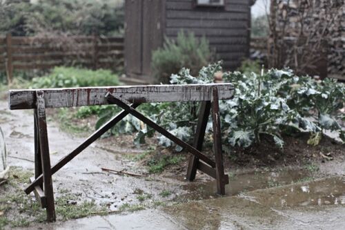 車止めの様で車止めではない。 廃業した木材店から大量の製材された 木材と共に貰ったもの。 ノコの傷や塗料に亡き主人の姿を見る。